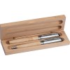Set d'écriture Mark Twain composé d'un stylo à bille twist (encre bleu) et d'un roller en métal avec corps en bois. L'ensemble est emballé dans une boîte en bois de haute qualité. Votre publicité sera gravée à droite du clip (le prix est pour les deux stylos). En raison de matière naturelle, chaque article et chaque gravure sont uniques.